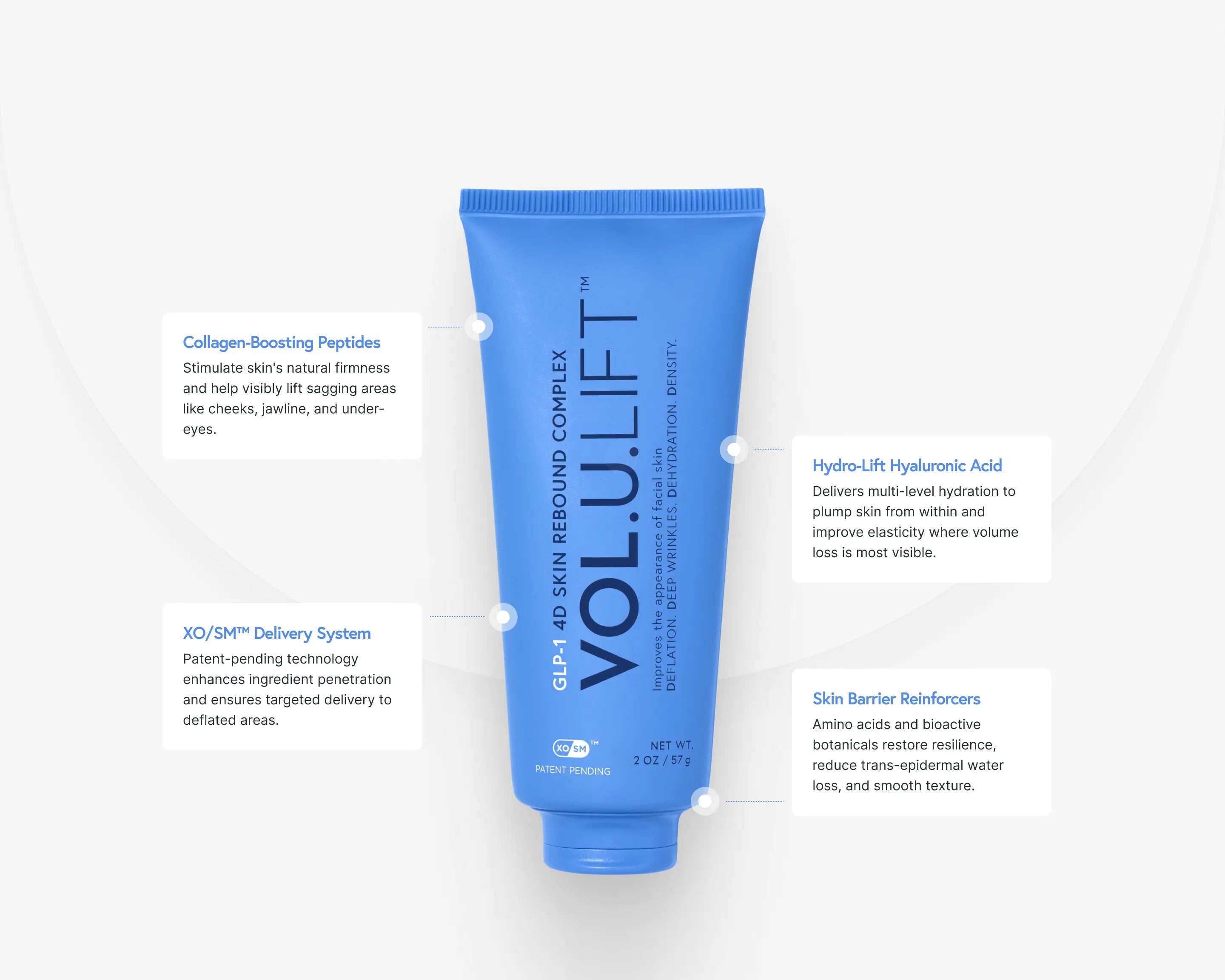 As a plastic surgeon, I see firsthand the long-term side effects of GLP-1 on overall skin health, and this is why I developed VOL.U.LIFT.This breakthrough formulation corrects these facial changes while nourishing the skin’s barrier for a solution that can be used as a standalone product or accompanying professional procedures for radiant, younger-looking skin.